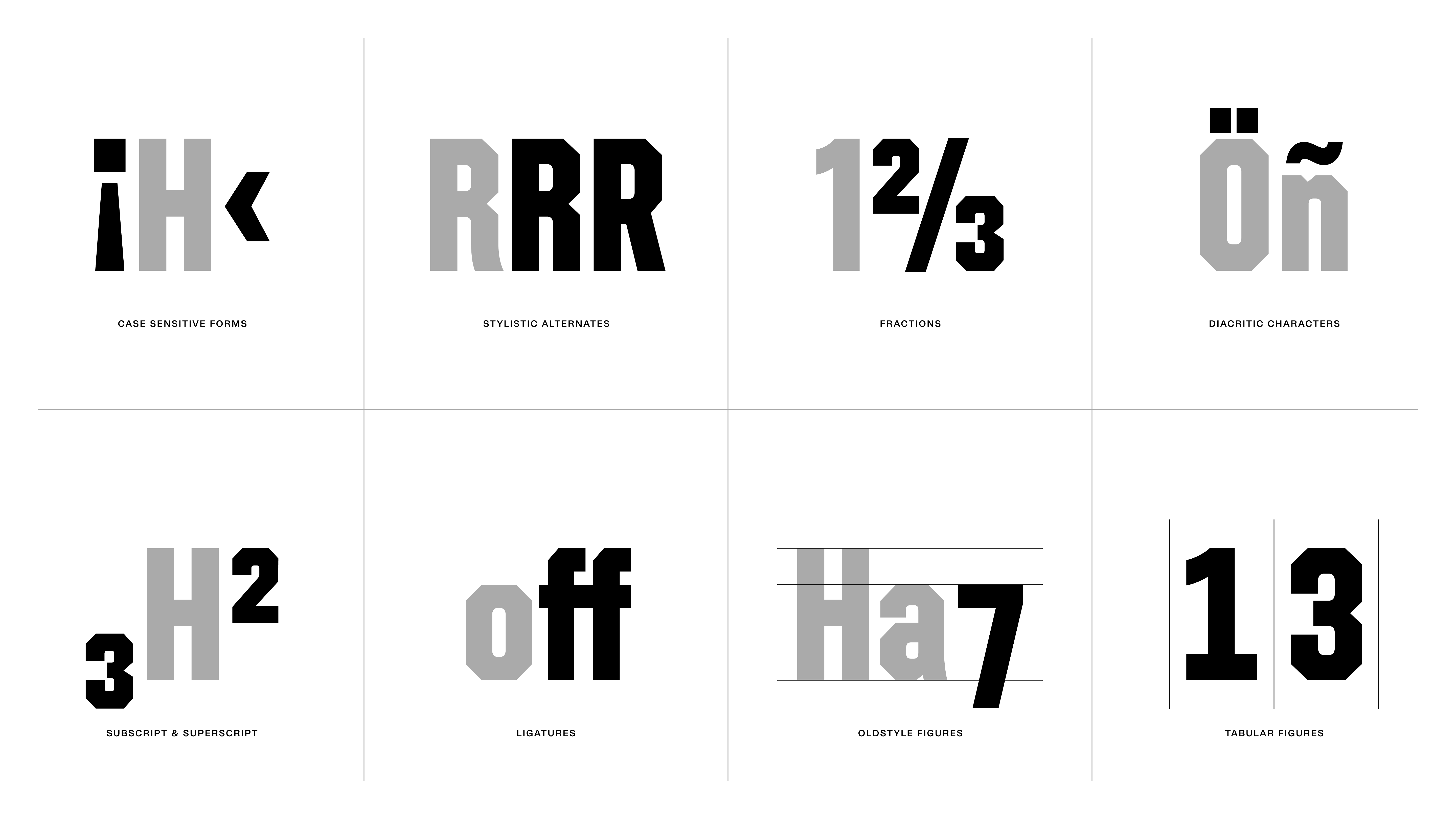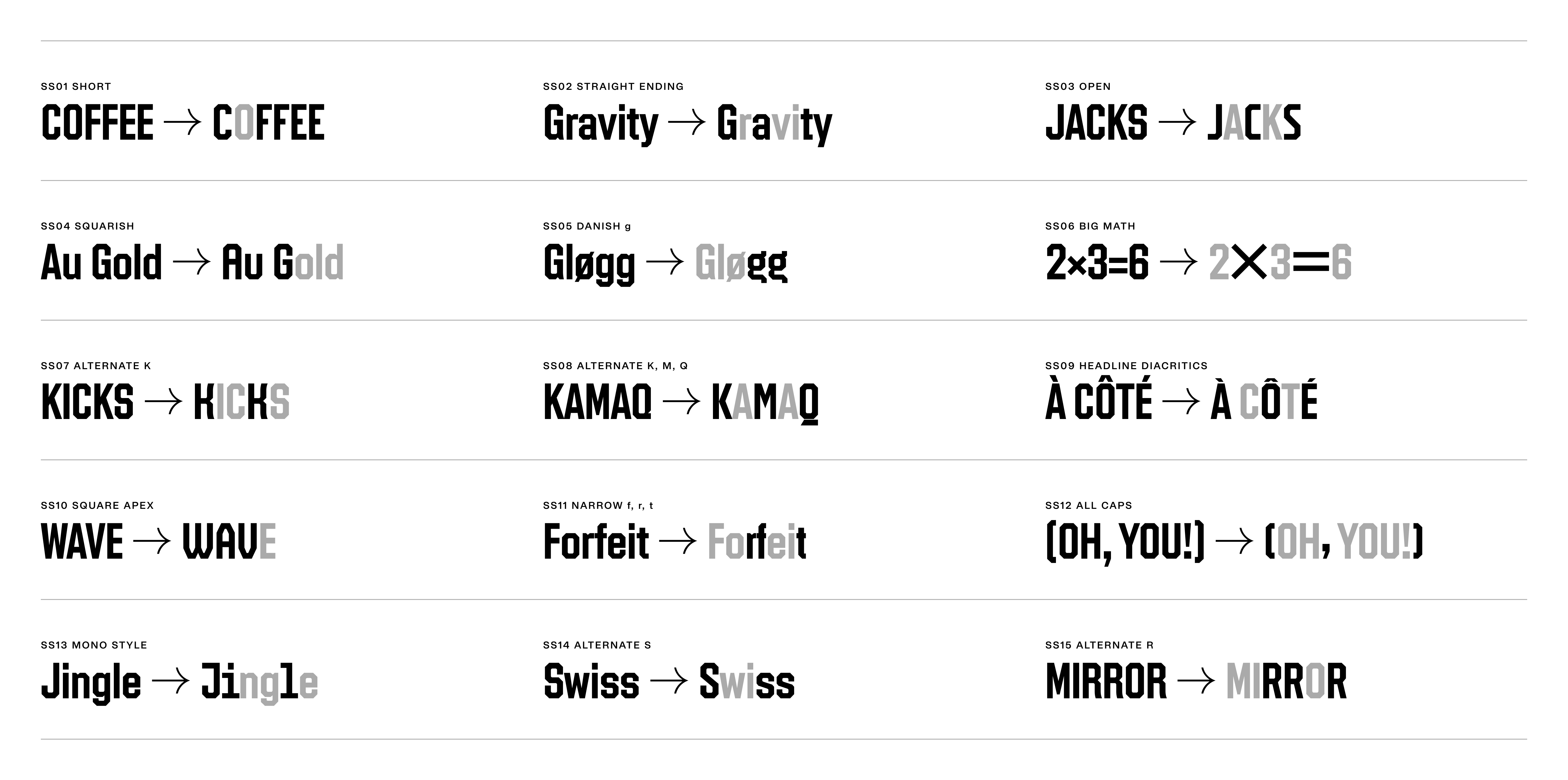 The AAA Collection comes in three different widths: Condensed, Normal, and Expanded, each with nine weights ranging from Thin to Black. Additionally, it includes Display versions with super-tight tracking, optimized for bold display settings at any scale. And with a rich set of stylistic alternates, AAA offers extensive options for shaping its overall expression within a cohesive system.