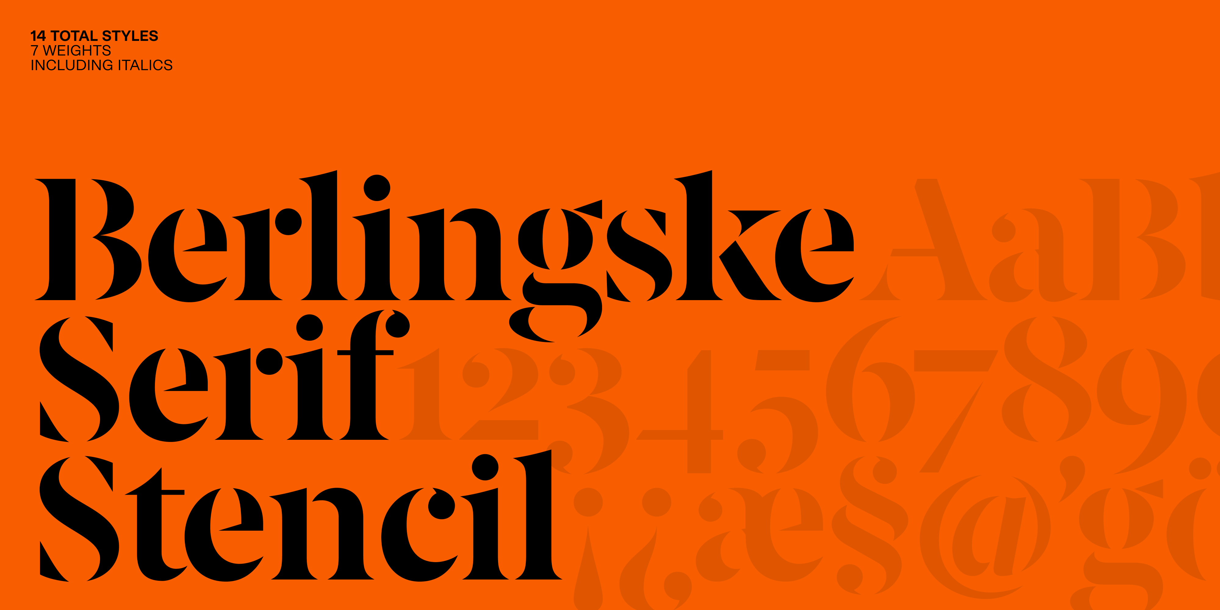 Berlingske Serif Stencil has a sophisticated and elegant look that is combined with a stencil style without loosing its connections to the essence of the original serif. The hairlines are removed from the glyphs so that only the wide stroke from the pen is left behind and the optical perception gives the text a very refined and exclusive look. The stencil style is very effective when used for headlines, labels and displays where it provides an individual and unique expression.