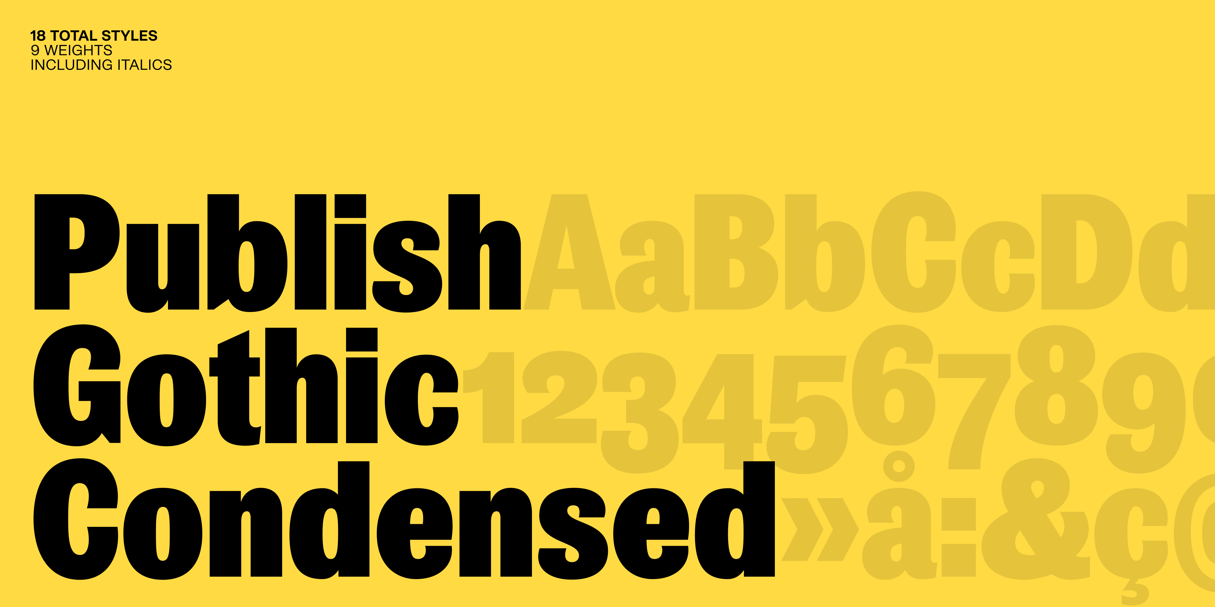 Publish Gothic is a lively contemporary typeface packed with personality and up to date usability. Utilising the quirks and charm found in the emerging sans serif typefaces of the 19th century. The typeface family includes a total of 54 individual styles, divided into three different widths; condensed, normal and expanded, accompanied with italics. This makes it a highly multifaceted and functional typeface system. Publish Gothic includes all the open type features expected of contemporary typefaces. A range of stylistic sets let the user explore and tune the overall look and feeling of Publish Gothic, which ultimately adds to its wide range of use.
