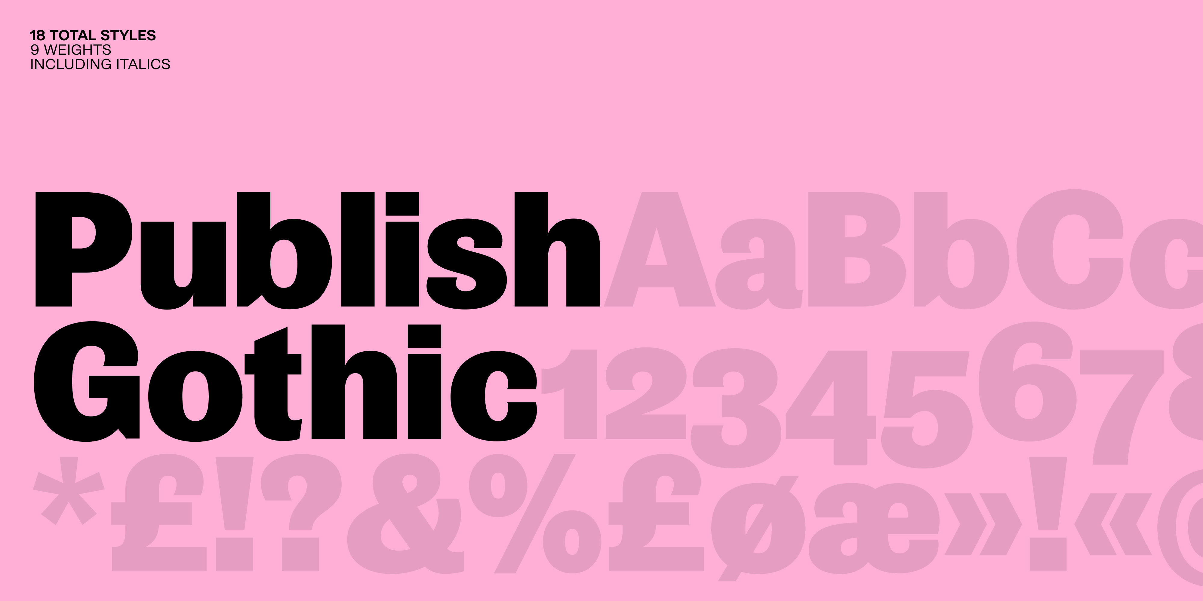 Publish Gothic is a lively contemporary typeface packed with personality and up to date usability. Utilising the quirks and charm found in the emerging sans serif typefaces of the 19th century. The typeface family includes a total of 54 individual styles, divided into three different widths; condensed, normal and expanded, accompanied with italics. This makes it a highly multifaceted and functional typeface system. Publish Gothic includes all the open type features expected of contemporary typefaces. A range of stylistic sets let the user explore and tune the overall look and feeling of Publish Gothic, which ultimately adds to its wide range of use.